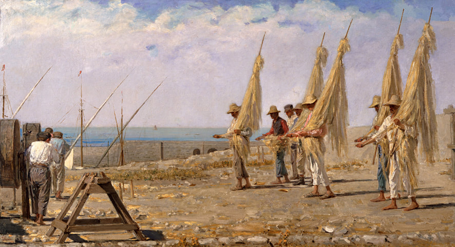 Fu Raffaello Causa ad aprire, nel 1975, il dibattito su questo quadro importante nella storia della pittura italiana della seconda metà dell’Ottocento. Si chiese lo studioso quale fosse il tema centrale dell’opera, il paesaggio o la fatica degli uomini. Credo che la domanda servisse soltanto a sottolineare la complessità del quadro, e a “dirigere” l’attenzione degli studiosi e del pubblico sull’importanza della pittura “sociale” che l’Esposizione napoletana del 1877 aveva chiaramente consacrato come protagonista anche del mercato. E non per caso Francesco Netti notò e scrisse che in quella Esposizione era del tutto assente la pittura di paesaggio: in realtà, i “macchiaioli” toscani e i pittori napoletani della “Scuola di Portici” tentavano di mettere insieme i due temi, quello “sociale” e il paesaggio, seguendo la strada suggerita già nel 1864 da Telemaco Signorini con il quadro “L’ alzaia”, in cui degli uomini trascinano a forza di braccia un’imbarcazione lungo l’Arno. Nel 1883 anche Antonino Leto dedicò ai “funari” un quadro significativo.