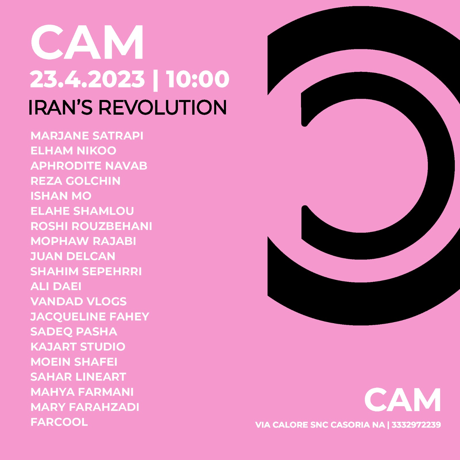 Gran finale domenica 23 aprile. Alle 10 si riaprono i battenti del festival con la mostra Iran’s Revolution. Alle 10.30 alla sala teatro Cam è prevista la proiezione del film “Persepolis” di Marjane Starapi che anticipa il collegamento con la nota regista ed illustratrice, previsto per le 12.15 e che chiuderà questa tre giorni sempre ad ingresso libero. La manifestazione rientra nell’ambito del cartellone degli eventi finanziati da Città Metropolitana di Napoli.