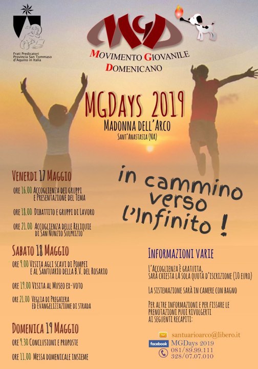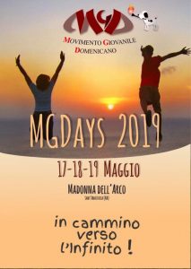 «In cammino verso l’infinito» è il tema della quinta edizione di MGDAYS, il raduno annuale dei giovani Domenicani del Sud Italia e di altre province. MGDAYS 2019, evento di pastorale giovanile domenicana, si terrà a Madonna dell’Arco da venerdì 17 a domenica 19 maggio.