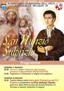 Si comincia venerdì alle 16, con l’accoglienza e la presentazione del tema, «In cammino verso l’infinito». Alle 18, dibattito e formazione dei gruppi di lavoro. Alle 21, il rettore padre Alessio Romano accoglierà in Santuario le reliquie di San Nunzio Sulprizio, santo della sofferenza recentemente canonizzato da Papa Francesco e si darà inizio ad una veglia di preghiera. San Nunzio, nativo di Pescosansonesco e morto a Napoli nel 1836, era un operaio cattolico proveniente da famiglia umile. Restò orfano presto e la sua giovinezza fu segnata non solo dalla morte dei genitori ma anche dalla malattia: una carie ossea sopravvenuta in seguito alla ferita procuratasi ad una caviglia. Si recò a Napoli proprio per curarsi, alla fine però sopravvenne la cancrena e fu necessario amputare gli arti. Morì tra sofferenze atroci a soli diciannove anni, senza però dimenticare – anche nei momenti di indicibile dolore – di consolare i suoi compagni di afflizione. Le reliquie resteranno a Madonna dell’Arco fino a venerdì 24 maggio quando, alle 18, 30, la Santa Messa sarà presieduta da don Antonio Paone, parroco di San Domenico in Soriano e Nunzio Sulprizio, dove le spoglie del santo torneranno.