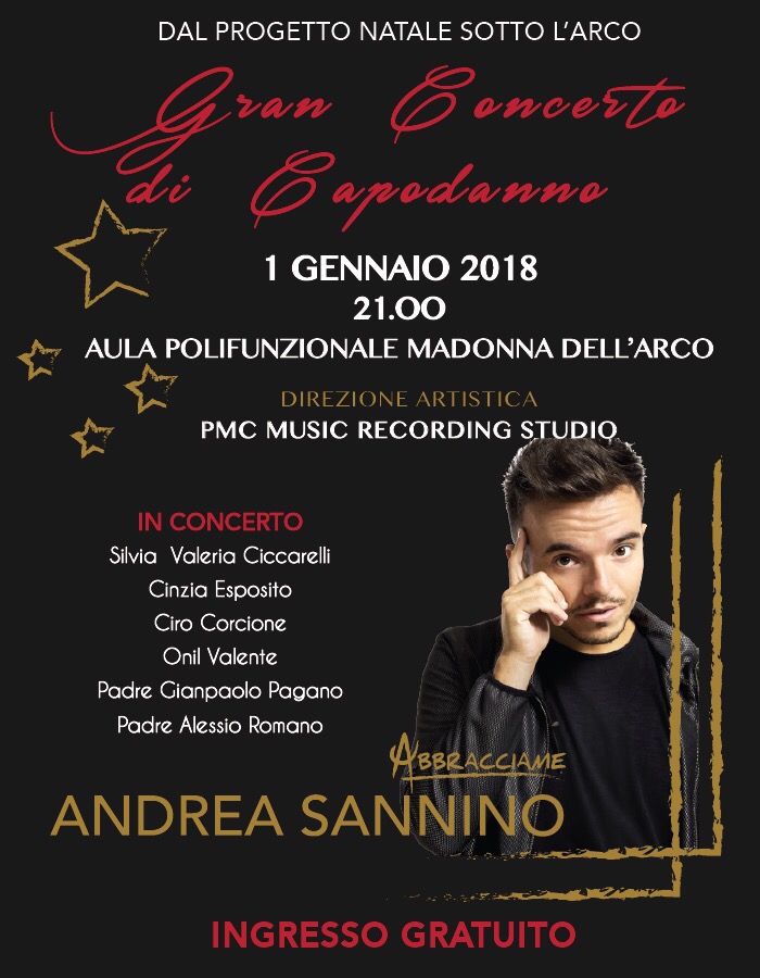 Alle 21 di questa sera, 1 gennaio 2018, l’anno comincia bene a Sant’Anastasia con Natale sotto l’Arco. L’evento di Capodanno della kermesse con la direzione artistica della Pmc Music School & Recording Studio vedrà in concerto Andrea Sannino che sta spopolando con “Abbracciame”. L’artista sarà preceduto dalle voci che hanno inciso il cd “Quando l’amore diventa poesia” i cui proventi andranno in beneficenza: Silvia Ciccarelli, Cinzia Esposito, Onil Valente, Ciro Corcione e i sacerdoti padre Alessio Romano – rettore del Santuario Mariano – con padre Gianpaolo Pagano. L’ingresso è gratuito.