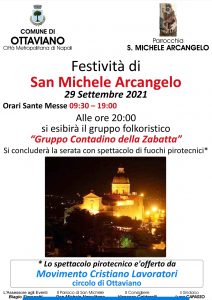 Quest’ anno Ottaviano festeggia San Michele il 29 settembre con i riti religiosi, con la “tammorra” del “gruppo Contadino della Zabatta” e con i fuochi d’artificio. Il 15 aprile 1663, nella pubblica piazza, presenti il Governatore Lelio Barone, gli Eletti Didaco Bifulco, Baldassare de Lugo, Carlo dell’Annunziata, Matteo Finelli e il cancelliere notaio Giuseppe Mazza, si riunirono deputati e cittadini: erano stati convocati dal messo Giovan Battista Menechino per discutere di cose importanti. Prima si stabilì di firmar la pace e di sottoscrivere un nuovo capitolato col Principe di Ottajano, Giuseppe I Medici, poi si discusse del giorno da consacrare a San Michele. “Anco se propone come al tempo della buona memoria di Innocenzo X Summo Pontefice furono levate con bulla particolare tutte le feste riserbandose però ogni città et terra di eligere un Santo protettore et di quello se ne facesse festa comandata nella sua giornata et poiché questa nostra Università per sua particolare devozione sempre ha tenuto e tiene per suo particulare Protettore il Glorioso San Michele Arcangelo, la festa del quale da pochi anni a questa parte si è indotta a farsi fra l’ottava di sua festa, però per evitarsi alcuni inconvenienti et impedimenti che possono nascere in detta festa, saria però da bene supplicarne i Signori Superiori Ecc.mi, che la giornata dell’8 maggio fusse festa comandata per celebrarne detta festa solenne di detto Glorioso Santo.”. La proposta degli Eletti fu approvata all’unanimità da deputati e cittadini. E gli Ottajanesi manifestarono tutta la loro gioia “intrecciando carole al suono dei tamburi e delle viole”. Gli aspetti “vesuviani” del culto, intensificati, a partire dal 1631, dalle eruzioni del Vesuvio, si innestarono nella funzione antiluterana che la Controriforma aveva conferito ai carismi dell’Arcangelo, sollecitando i pittori a dar forma e colore a questa idea e a rappresentare il duello tra angelo e diavolo, in ogni possibile modo, non escluso quello dell’ironia. Si pensi alla rabbia dolente del diavolo che Filippo Vitale dipinse alla Pietà dei Turchini, e alle sconvolte espressioni dei demoni che Angelo Mozzillo disegnò nel quadro che si conserva nella sacrestia della Chiesa Madre di Ottaviano. Quando l’8 maggio fu consacrato a San Michele, su Ottajano già vegliava il gigantesco arcangelo di legno, che negli anni ’30 dell’Ottocento venne sostituito, durante le processioni, dalla statua di San Michele “’o piccerillo”, donata alla Chiesa da Luigi de’ Medici. Nell’assemblea generale del 6 luglio 1664- sindaco Giuseppe Del Giudice, Eletti Fabio Iovino, Simone Di Lugo e Andrea Bifulco, cancelliere Giuseppe Mazza- gli Ottajanesi, dopo aver ascoltato attentamente la lettura dei 30 articoli della bozza di capitolato elaborata dai loro avvocati e da quelli di Giuseppe I Medici, furono informati dagli Eletti che Carlo Mazza aveva comprato per 30 ducati due moggia di territorio demaniale al Campitello, e che i 15 ducati che toccavano alla “Universitas Octajani” erano stati dati “per elemosina alla nostra Magistrale Chiesa di San Michele Arcangelo in subsidio dell’opera et spesa fatta nell’indoratura della cona et baldacchino di detto Glorioso Santo Protettore con apparenza grande a sodisfazione di tutti…”.I Prefetti dell’Italia unita cancellarono dal calendario la processione del 29 settembre, che portava la statua del Patrono fino agli orti di Recupo e della Zabatta, mentre la processione dell’ 8 maggio percorreva un tratto della strada che portava, e porta, a Somma: era giusto che il Santo Patrono volgesse il suo benefico sguardo a tutto il territorio di Ottaviano, da un capo all’altro.