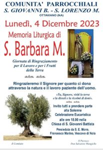 Lunedì, 4 dicembre, a partire dalle ore 18.00, le Comunità parrocchiali di San Giovanni Battista e di San Lorenzo Martire celebreranno, nella Chiesa di San Giovanni, la “Memoria liturgica di Santa Barbara Martire”. Presiederà la “Celebrazione Eucaristica” S. E. Mons. Francesco Marino, Vescovo di Nola.