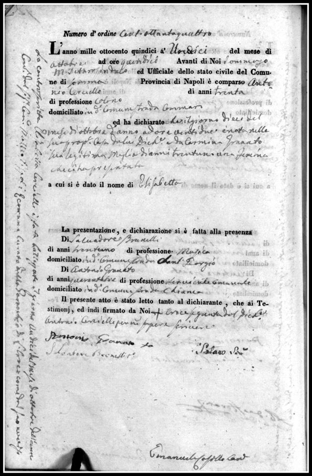 Oggi che sono li quattro del mese di gennaio del presente anno mille ottocento nove ad ore venti è comparso avanti del Signor Sindaco di questa Università il signor Luca Esposito alias Alaja di professione bracciale d’anni trenta. Domiciliante in detta Università, ed abitante nella strada d(etta) S. Croce numero (civico mancante). Il medesimo ha presentato una bambina che ha dichiarato esser nata in costanza di legittimo matrimonio tra esso dichiarante con la Sig(nor)a Margherita Molaro. La quale (bambina) è nata il giorno due del mese di gennaio, ad ore due della notte, ed a tenore della dichiarazione se li sono imposti i seguenti nomi: Angela Rosa.