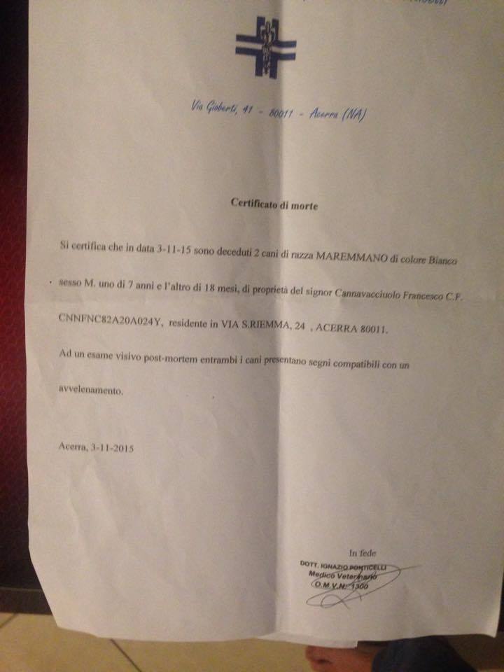 Si chiamavano “Sergente” e “Belle”, rispettivamente di 7 anni e di 1 anno e mezzo, erano due splendidi esemplari maschi di “maremmani”, di proprietà della famiglia dei pastori-ambientalisti di Acerra, i Cannavacciuolo, personaggi simbolo della lotta ai mali della Terra dei Fuochi. Sergente e Belle sono stati uccisi con il veleno, il 2 novembre scorso, stando alla diagnosi del veterinario, che conferma l’ipotesi dell’avvelenamento. I “maremmani” dei Cannavacciuolo ( il giovane Alessandro, 27 anni, è un noto e agguerrito ecologista della zona ) hanno sporto denuncia contro ignoti, alla polizia. Sul posto, una proprietà recintata nella campagna di Acerra, in via Ciminiera, località Pagliarone, si sono recati gli agenti del commissariato locale. Non sono state trovate tracce di veleno sul terreno per cui si pensa che la sostanza mortale sia stata data agli animali da qualcuno, forse mescolata a qualche boccone di carne. Da tempo i Cannavacciuolo lì, nel recinto di contrada Pagliarone, non avevano più le loro pecore, tremila capi abbattuti nel 2008 per la presenza di diossina nel sangue. Fu un caso clamoroso, che ha poi spinto la famiglia di allevatori a ingaggiare una battaglia contro l’ecomafia. I loro cani si trovavano nel recinto di proprietà della stessa famiglia di pastori, che hanno una passione cinofila. Di Sergente e Belle si prendeva cura tutti i giorni un fratello di Alessandro, Franco. Intanto per Alessandro Cannavacciuolo questa è stata l’ennesima minaccia indirizzata a lui e a tutta la sua famiglia. Il giovane ambientalista ha anche messo su Facebook una foto molto eloquente: “Io ci metto la faccia: uccidete anche me”, la scritta sul cartello impugnato dall’attivista della Terra dei Fuochi. La sequenza della minacce denunciate alle forze dell’ordine dai Cannavacciuolo è lunga. Per motivi di spazio se ne può citare solo qualcuna. Febbraio 2006: ignoti uccidono a colpi di lupara alcune pecore del loro gregge. Alcuni capi vengono ritrovati con le teste mozzate. Aprile 2008: un camion sperona la macchina con all’interno Mario e Alessandro Cannavacciuolo, padre e figlio. L’auto esce fuori strada, piomba in un canale. I due finiscono in ospedale. Nessuna traccia del camion. Dicembre 2008: i Cannavacciuolo denunciano altre minacce e un tentato investimento. Luglio-agosto 2011, messaggi anonimi e telefonate al cellulare di Alessandro: “Ancora uno e sei morto”, “Ti metto il ……. in bocca”. 30 settembre 2012: le saracinesche del negozio della famiglia Cannavacciuolo vengono imbrattate e bloccate, di notte, con della colla speciale, rossa. Solo con l’aiuto del fabbro sarà possibile riaprire l’esercizio commerciale, inaugurato dopo l’abbattimento del gregge. Agosto 2013: l’auto di Mario Cannavacciuolo viene manomessa, proprio nei pressi del recinto di contrada Pagliarone. I soliti ignoti hanno riempito il tubo di scappamento con del materiale filamentoso. Febbraio 2014: Alessandro trova un proiettile sull’uscio del negozio. Tutti fatti inquietanti per altrettante denunce depositate presso i presidi territoriali della polizia e dell’arma dei carabinieri. Che non sono mai riusciti a venirne a capo.