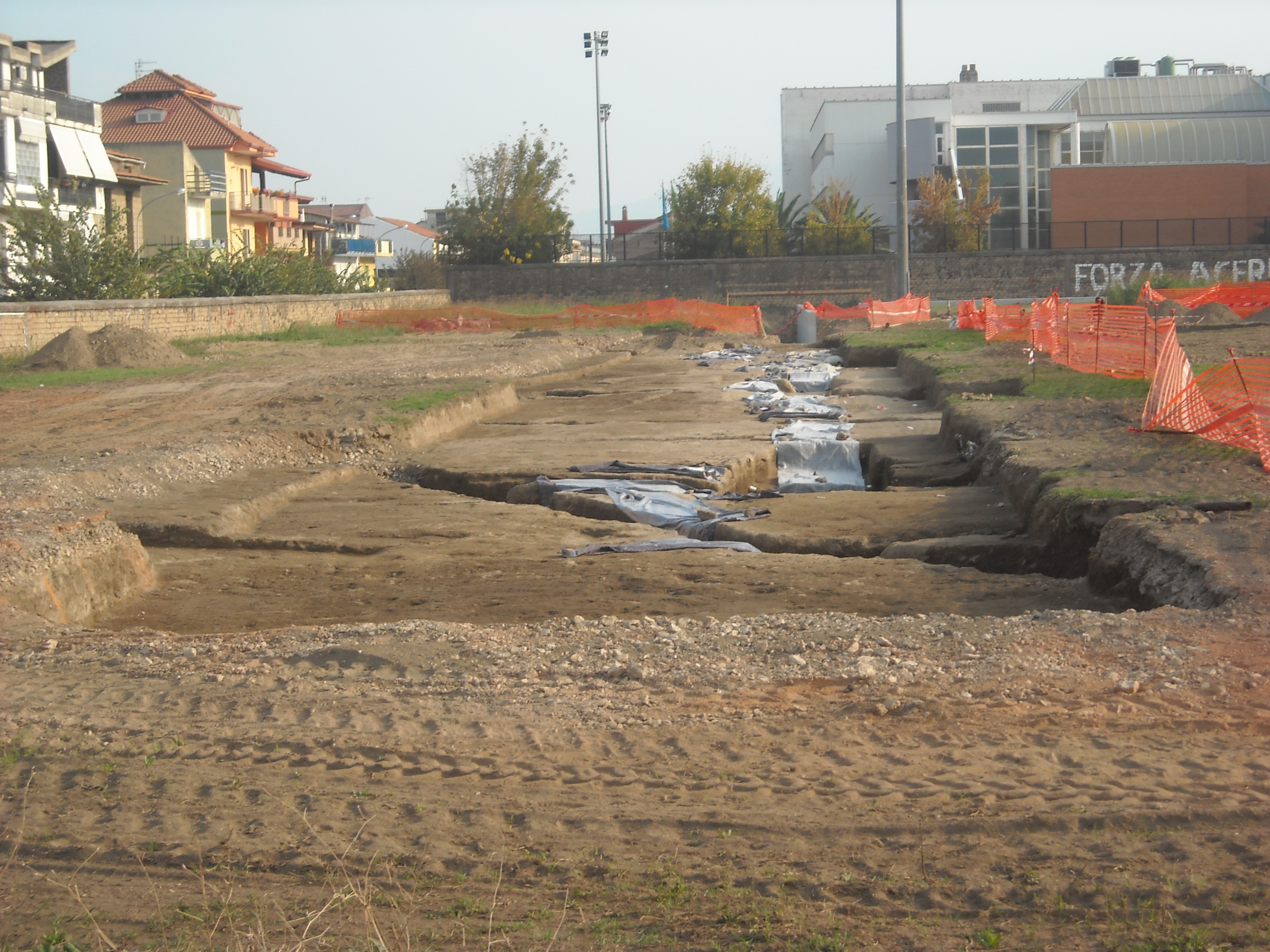 Il Comune aveva avviato i lavori di abbattimento dello stadio comunale per fare posto ad un parco pubblico e ad altre attrezzature. Ma in un’ampia zona del cantiere le ruspe si sono dovute improvvisamente fermare perché dal campo di calcio municipale sta affiorando l’antica città romana di Acerrae. Un’importante pagina di storia dell’hinterland partenopeo sta emergendo proprio sotto il profilo bianco e moderno del municipio, ubicato al di là del recinto dello stadio da eliminare.E’probabilmente la scoperta archeologica più importante finora fatta in questo territorio dopo il ritrovamento, all’inizio del secolo scorso, dei resti di Suessola, la città prima osca e poi etrusca ubicata quattro chilometri a nord di Acerra. Intanto la soprintendenza archeologica ha dichiarato “il fermo lavori” nell’area del cantiere in cui si sta procedendo al rinvenimento dei reperti. Non si sa a questo punto cosa possa succedere. Lo spazio dello scavo da cui sono affiorate le antiche vestigia già ricopre quasi mezzo campo di calcio ma l’opera degli archeologi è appena iniziata. La sensazione è che si stiano profilando nuove e più importanti sorprese. Lo scavo archeologico si trova a circa trecento metri a nord est del quattrocentesco castello baronale, sorto sui resti del teatro romano, e a cinquecento metri dal decumano e dal duomo. Si sospetta dunque che l’antica città romana fosse di notevoli dimensioni. Del resto Acerrae, con Neapolis, Nola, Pompei, Stabiae, Ercolano e Oplonti, era una delle città più importanti della cosiddetta Campania Felix. Molti dei suoi più preziosi reperti si trovano nel museo archeologico nazionale e nel nuovo museo allestito di recente nel castello baronale. Altre importanti antiche testimonianze acerrane sono custodite anche nel British Museum, a Londra. A ogni modo Acerra non è nuova a questi ritrovamenti. Qui basta scavare nel sottosuolo anche soltanto di mezzo metro per entrare a contatto con la storia. Sempre qui, tre anni fa, durante i lavori di rifacimento della strada provinciale che collega Acerra con Caivano è stata ritrovata una necropoli, quasi subito malamente ricoperta per consentire la prosecuzione delle opere viarie.
