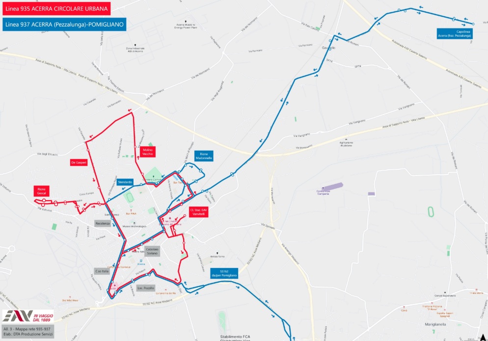 Da Lunedì 6 Ottobre, inoltre, attiva la Linea 937 Acerra Pezzalunga-Pomigliano d’Arco programma con 5 coppie di corse a/r giornaliere (dal lunedì al sabato) di cui una coppia di corse, prettamente scolastica, con partenza da Acerra Stazione EAV (via Vanvitelli) alle ore 6.55 e da Pomigliano d’Arco (capolinea Staz. EAV) alle ore 14.00 utile per uscita dell’utenza scolastica dagli istituti di Pomigliano. Il servizio si sviluppa su un itinerario con capolinea presso la frazione Pezzalunga, per dirigersi su percorso cittadino per poi diramarsi verso l’area abitativa del Pozzillo raggiungendo Pomigliano attraverso il raccordo della SS162.
