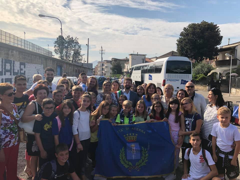 Gli alunni del Secondo Circolo Didattico “Don Peppe Diana” di Acerra porteranno la bandiera del Comune di Acerra alla cerimonia ufficiale di inaugurazione dell’anno scolastico che si terrà lunedì 17 settembre all’isola d’Elba alla presenza del Presidente della Repubblica Sergio Mattarella e del Ministro dell’Istruzione Marco Bussetti. La bandiera del Comune è stata consegnata questa mattina dal Sindaco Raffaele Lettieri ai 27 alunni (in rappresentanza di tutti i musicisti e coristi) della scuola di Acerra invitati con la loro “Don Diana Children Orchestra” a cantare il proprio inno alla manifestazione in programma presso l’istituto “Cerboni” di Portoferrato.