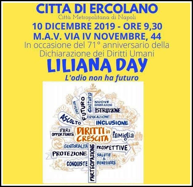 Liliana Day, il nome del convegno, è programmato in coincidenza con il 71esimo anniversario della Dichiarazione Universale dei Diritti Umani, adottato dall’ Assemblea Generale delle Nazioni Unite il 10 dicembre 1948 a Parigi. L’evento impegnerà molti Comuni italiani in attività di sensibilizzazione sul tema, alla luce delle vicende che hanno interessato la senatrice, sopravvissuta ad Auschwitz ed oggi sotto scorta per le minacce subite. Al convegno saranno presenti il sindaco del Comune di Ercolano Ciro Buonajuto, l’ Assessore alle Politiche Sociali Carmela Saulino, il parroco di Santa Maria del Pilar di Ercolano Padre Pasquale Incoronato, la sociologa Grazia Tatarella e il giovanissimo scrittore Carmine Molaro.