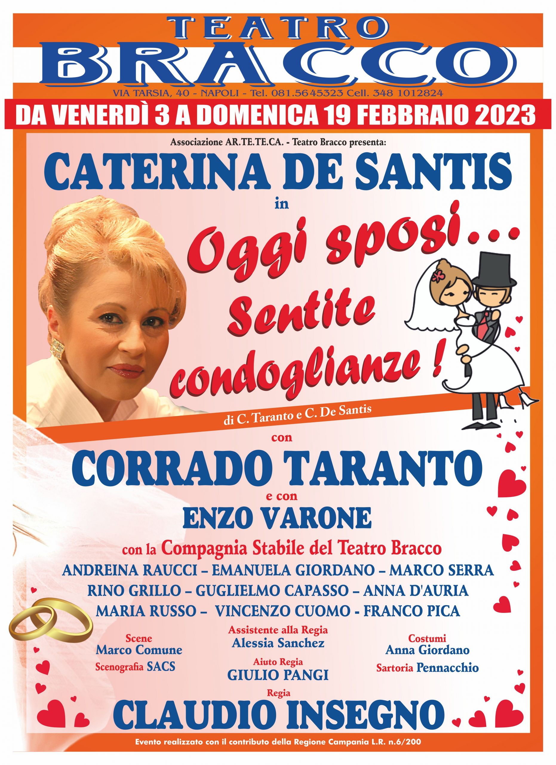 Uno spettacolo corale, un piccolo viaggio attraverso diverse forme di espressione teatrale, la commedia borghese, il monologo, il cab-teatro, la canzone, il varietà, un omaggio al mestiere dell’attore e al pubblico che torna a teatro dopo due anni di enormi difficoltà del settore. Questa la mission del Teatro Bracco. Certamente questi obiettivi della nuova commedia che sarà in scena da venerdì 3 febbraio fino a domenica 19 febbraio nella storica sala della Pignasecca diretta da Caterina De Santis, la quale sarà sul palcoscenico in: “Oggi sposi…Sentite condoglianze!”, che torna al Teatro Bracco di Napoli. Continui colpi di scena, e quando tutto sembrerebbe prendere la strada più… ecco pronto un nuovo colpo di scena.