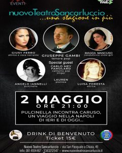 Si svolgerà giovedì 2 maggio, a partire dalle 21, nel prestigioso Teatro San Carluccio di Napoli, lo spettacolo “Pulcinella incontra Caruso: Viaggio nella musica” partendo dalla tradizione della maschera più famosa al mondo Pulcinella, interpretato dall’attore Angelo Iannelli.
