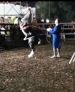Già da qualche anno i cavalli hanno riacquistato, nella Fiera di San Gennaro Vesuviano, il ruolo che ebbero nella seconda metà dell’Ottocento: mi riferisco ai cavalli da sella ai “destrieri”, perché ai cavalli da tiro era stato riservato uno spazio importante già negli anni di Murat. I documenti ci dicono che nel 1842 Giuseppe IV Medici consentì che andassero in Fiera cinque suoi cavalli di “razza napoletana”: cavalli montati, di solito, dai nobili e dagli alti ufficiali dell’esercito durante le sfilate e le parate, insomma cavalli da “teatro elegante”. Quest’anno il dott. Gino Aprile ha organizzato e presentato l’esibizione di due squadre di eccezione: quella, costituita da 18 cavalieri, del centro equestre “Chiara”, di Roma, diretto dal Maestro Marco De Masi, e il team “Sabatino Horse show” . E’ stato uno spettacolo strepitoso: i volteggi, in cui si è manifestata l’arte di Sabatino Pastore e di Ottavio Spezzacatena, la “posta” cosacca, i numeri di “scuola spagnola” in cui Marco De Masi ha guidato in modo magistrale il cavallo frisone Sander, e i giochi stupendi del pony Welch (v. foto in appendice).. Gino Aprile, artista del microfono, ha saputo attirare l’attenzione del pubblico sui dettagli preziosi- movimenti, impennate, inversioni, passi di danza, la musica del caracollare, e i gesti e le voci dei cavalieri -, e ha fatto in modo che al pubblico non sfuggisse la bellezza complessa, e tuttavia naturale, di una “giostra” di altri tempi, ma capace di dettare suggestioni anche oggi. I nobili cavalli, gli abili cavalieri e il sagace presentatore hanno offerto al pubblico, che non si stancava di applaudire, momenti esaltanti di “arte in movimento”, e vive emozioni.