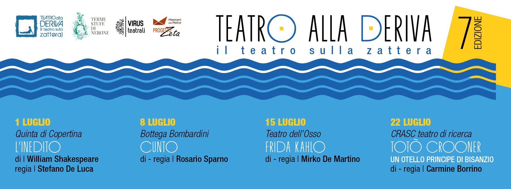 Alle Terme – Stufe di Nerone (Bacoli-NA) dall’1 luglio 2018 scatta la VII edizione della rassegna TEATROallaDERIVA (il teatro sulla zattera), ideata da Ernesto Colutta e Giovanni Meola, che ne cura la direzione artistica per il sesto anno.