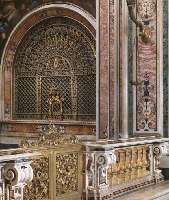 E parliamo della stanza che si affacciava sul presbiterio in cui le monache di clausura stavano in ginocchio ad ascoltare la messa seguendone la celebrazione attraverso la grata, “il comunichino”. Le monache più importanti occupavano i posti prossimi alla grata, vedevano l’altare, il celebrante e le prime file dei fedeli, e potevano anche essere viste e individuate da chi si avvicinava alla balaustra della navata. Si comunicava attraverso il “comunichino”, certamente: ma il nome era collegato al sacramento della comunione, non a profane comunicazioni.. Il “comunichino” di San Gregorio Armeno, la cui immagine correda l’articolo, venne realizzato, nel 1692, da Antonio Donadio, un Maestro della lavorazione dell’ottone e del rame, che interpretò con originalità le “intenzioni” barocche del disegno di Gian Domenico Vinaccia. Negli spazi vuoti di questa splendida grata venne tessuta, negli anni, una affascinante storia di sguardi e di silenzi loquaci, e attraverso la porticina centrale entrarono le ostie della comunione, ma anche – racconta la Caracciolo – le mani impure di sacerdoti che imprimevano carezze licenziose sulle guance e sulle labbra di monache giovani e meno giovani.