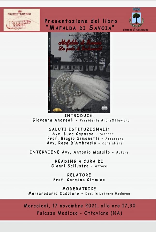 Mercoledì 17 Novembre, a partire dalle 17.30, verrà presentato a Ottaviano, nel Palazzo Medici” il libro “Mafalda di Savoia – La perla di Buchenwald”, in cui Antonio Masullo ricostruisce la storidella figlia di Vittorio Emanuele III e di Elena del Montenegro, che i nazisti deportarono nel lager di Buchenwald e che in quel luogo degli orrori morì in modo tragico.