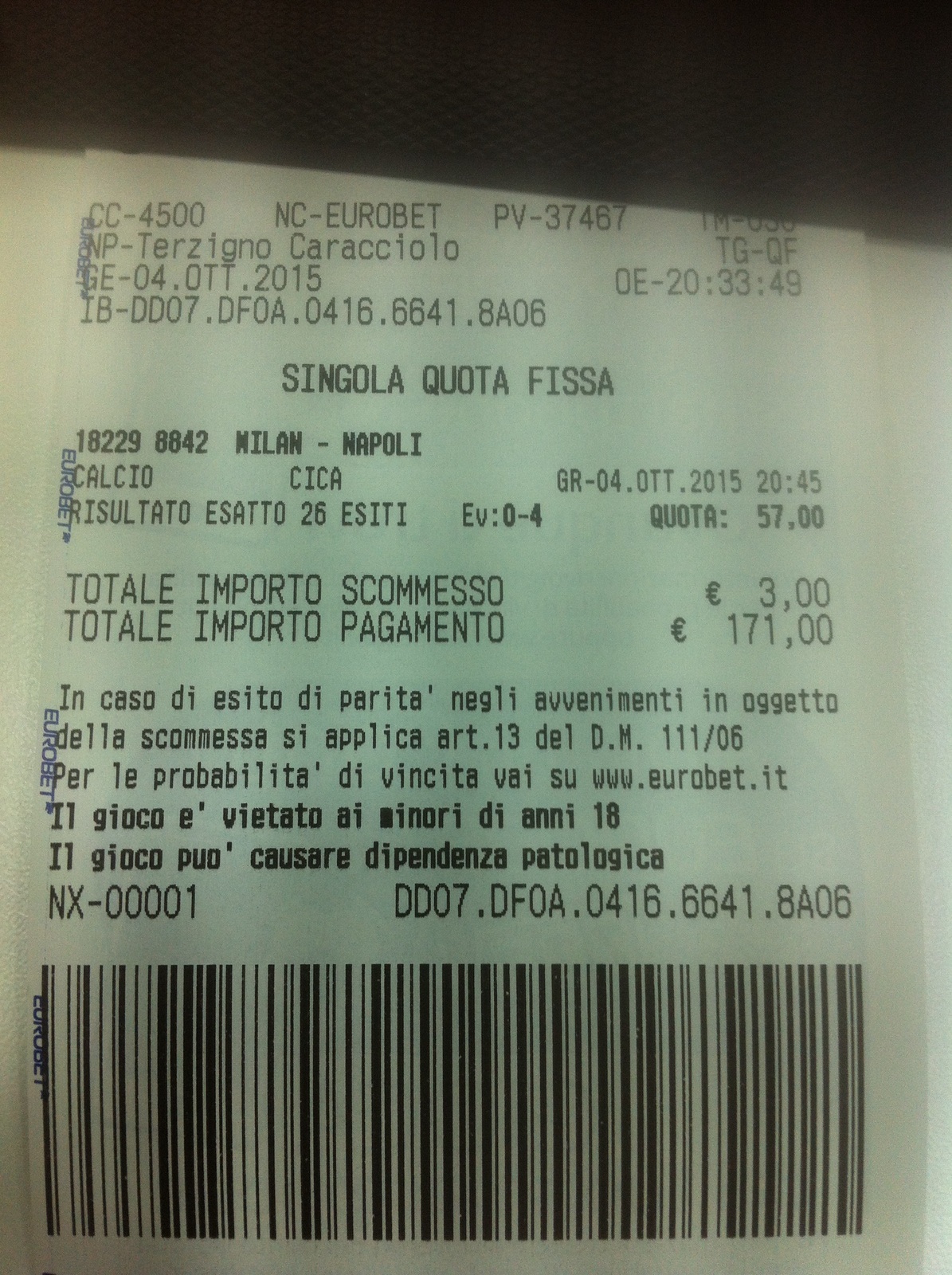 E nella sera dei miracoli (a Milano, of course) c’è spazio pure per due standing ovation: una è per l’arbitro Celi, di Juventus – Bologna, che ha regalato un rigore agli juventini costringendo tutti noi a tornare a fantasticare su ruberie varie, favori, sudditanza psicologica; l’altra è per Gennaro, un mio amico: ha giocato la bolletta mettendo 3 euro sul 4 a 0 secco a favore del Napoli. Ed ha vinto 171 euro (vedere la foto per credere): lui sì che è un vincitore, bravo!