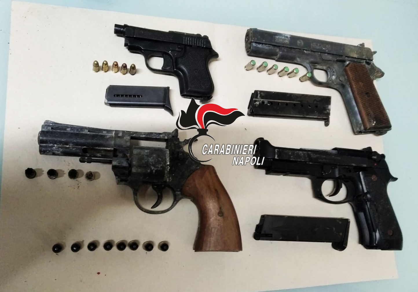 Una pistola a salve alterata, senza matricola ma con serbatoio e 5 munizioni calibro 8, una Magnum cal. 9×38 mm con 4 bossoli già esplosi nel tamburo. Tutte pistole posticce ma modificate per essere pronte a sparare e ammazzare. Tra queste una Bruni cal. 8 con 6 colpi nel serbatoio e una pistola a gas alterata cal. 6 e 8 cartucce GFL cal. 9×21. Tutte le armi sono state sequestrate e saranno sottoposte ad accertamenti di laboratorio così da collegarle ad eventuali fatti criminosi.