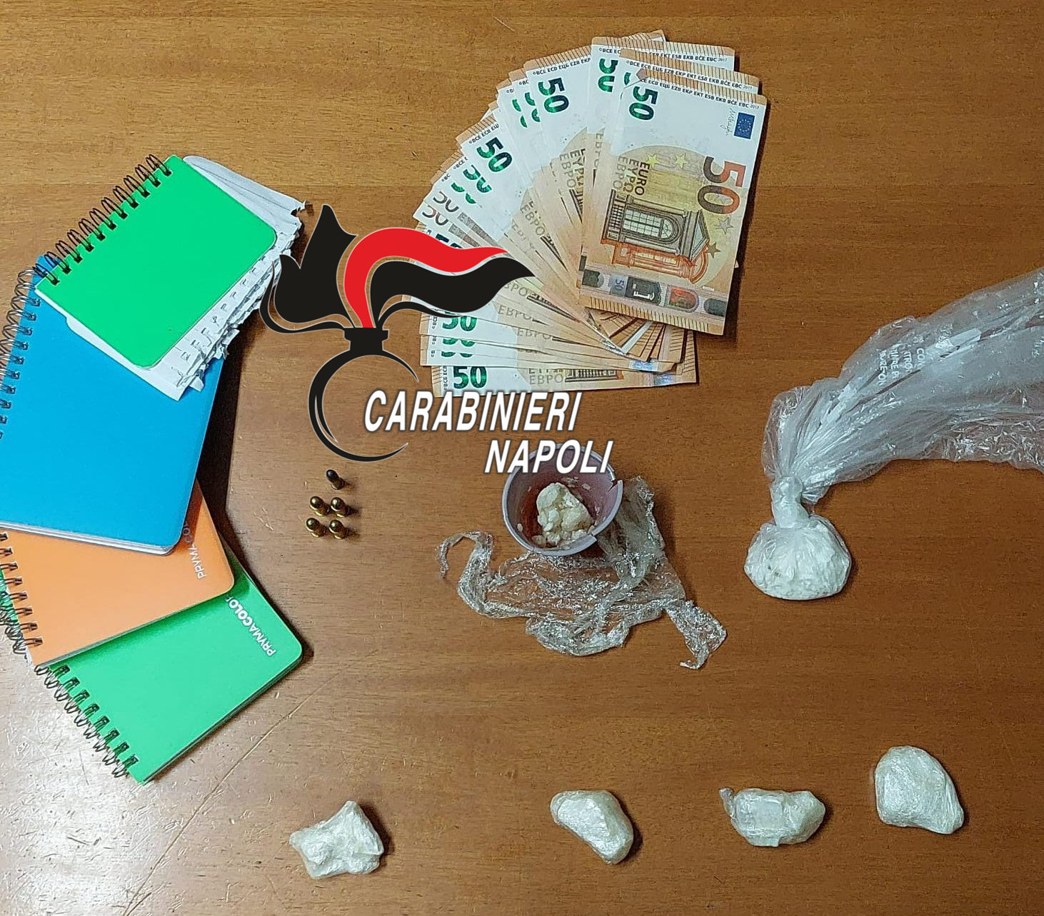 Denunciato un 26enne del posto per detenzione di droga a fini di spaccio e detenzione abusiva di munizionamento. Nella sua abitazione 86 grammi circa di cocaina, 1200 euro in contante ritenuto provento illecito e 5 proiettili calibro 22. Erano in un pensile della cucina.