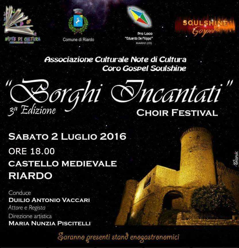 A Riardo fervono gli ultimi preparativi per la III edizione del “Borghi Incantati Choir Festival” e, in vista della partita Italia-Germania che si giocherà nella stessa serata, lo staff del Soulshine Gospel comunica che la rassegna avrà inizio alle h.18:00.