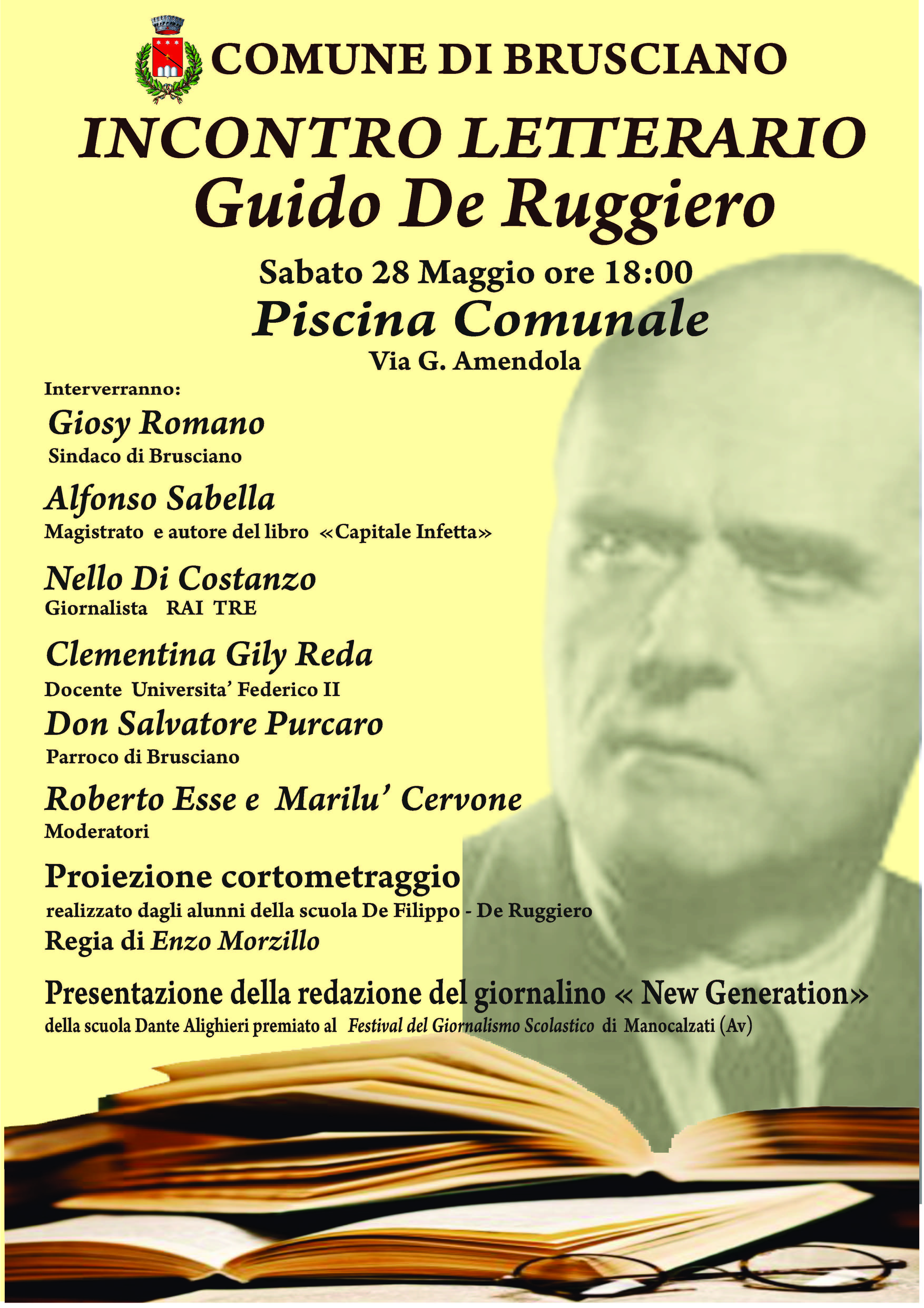 L’incontro letterario “Guido De Ruggiero” è in programma il giorno 28 maggio 2016, alle ore 18.30 nella piscina comunale di via Amendola a Brusciano.