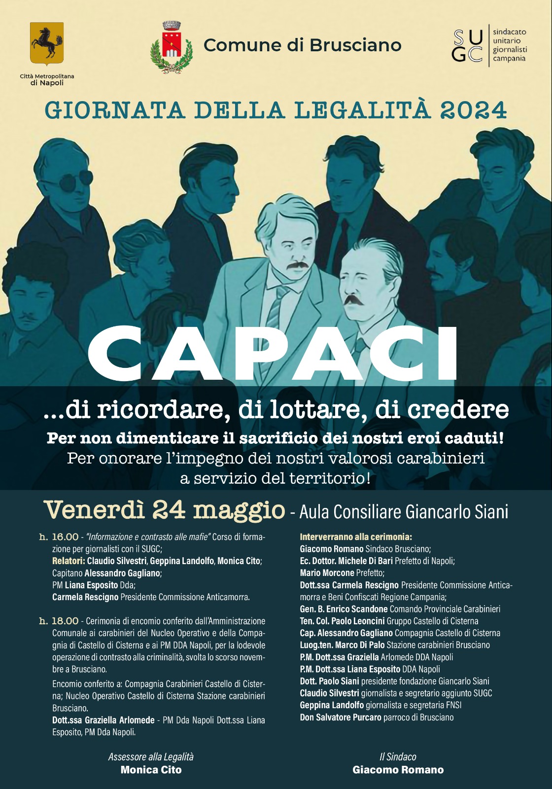 In occasione della Giornata della Legalità 2024 e della commemorazione della Strage di Capaci, l’’amministrazione del sindaco Giacomo Romano con l’ assessosarato alla Legalità, il giorno 24 maggio, nell’Aula Consiliare Giancarlo Siani, darà il via a due importanti iniziative per promuovere la cultura della Legalità: Un corso formativo per i giornalisti con il SUGC; una cerimonia di encomio con la quale si intende esprimere il più vivo apprezzamento e la più profonda riconoscenza, ai Militari dell’Arma della compagnia di Castello di Cisterna, per l’encomiabile impegno speso a servizio della comunità e del territorio, nel contrasto alla camorra.