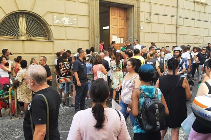 Nella strada stretta davanti alla sede del Comune di via Tommasi il traffico è praticamente bloccato. Le persone in attesa cercano riparo al grande caldo facendosi aria con i ventagli ed hanno il loro da fare per tenere a bada i figli piccoli che hanno portato con sé.