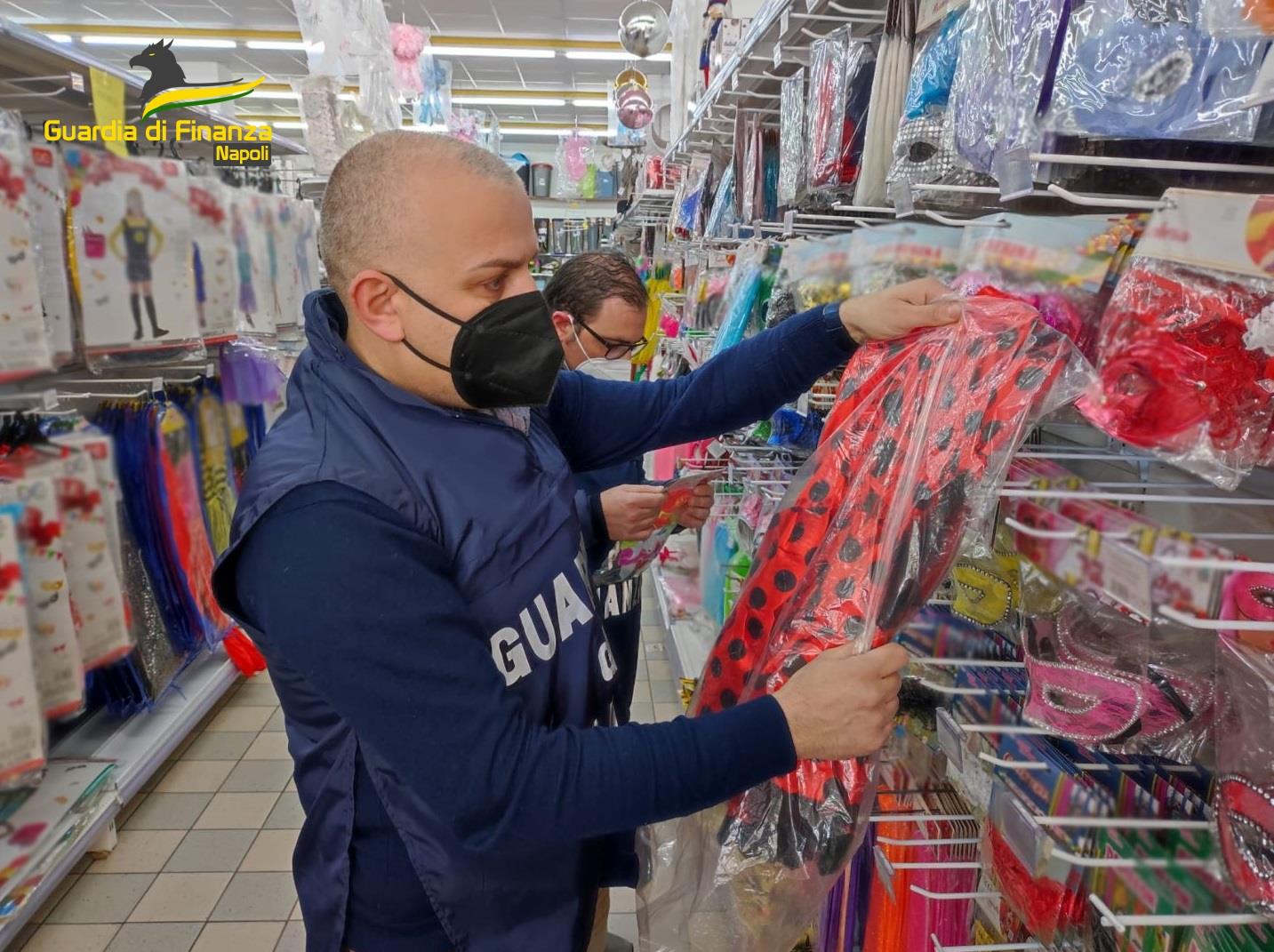 A Caivano, in un emporio gestito da un 49enne cinese, il Gruppo di Frattamaggiore ha sequestrato quasi 690.000 tra prodotti per la cura della persona, della casa, maschere e accessori di Carnevale esposti in vendita, privi della necessaria nota informativa in lingua italiana recante le indicazioni sulla qualità e le caratteristiche merceologiche del prodotto.