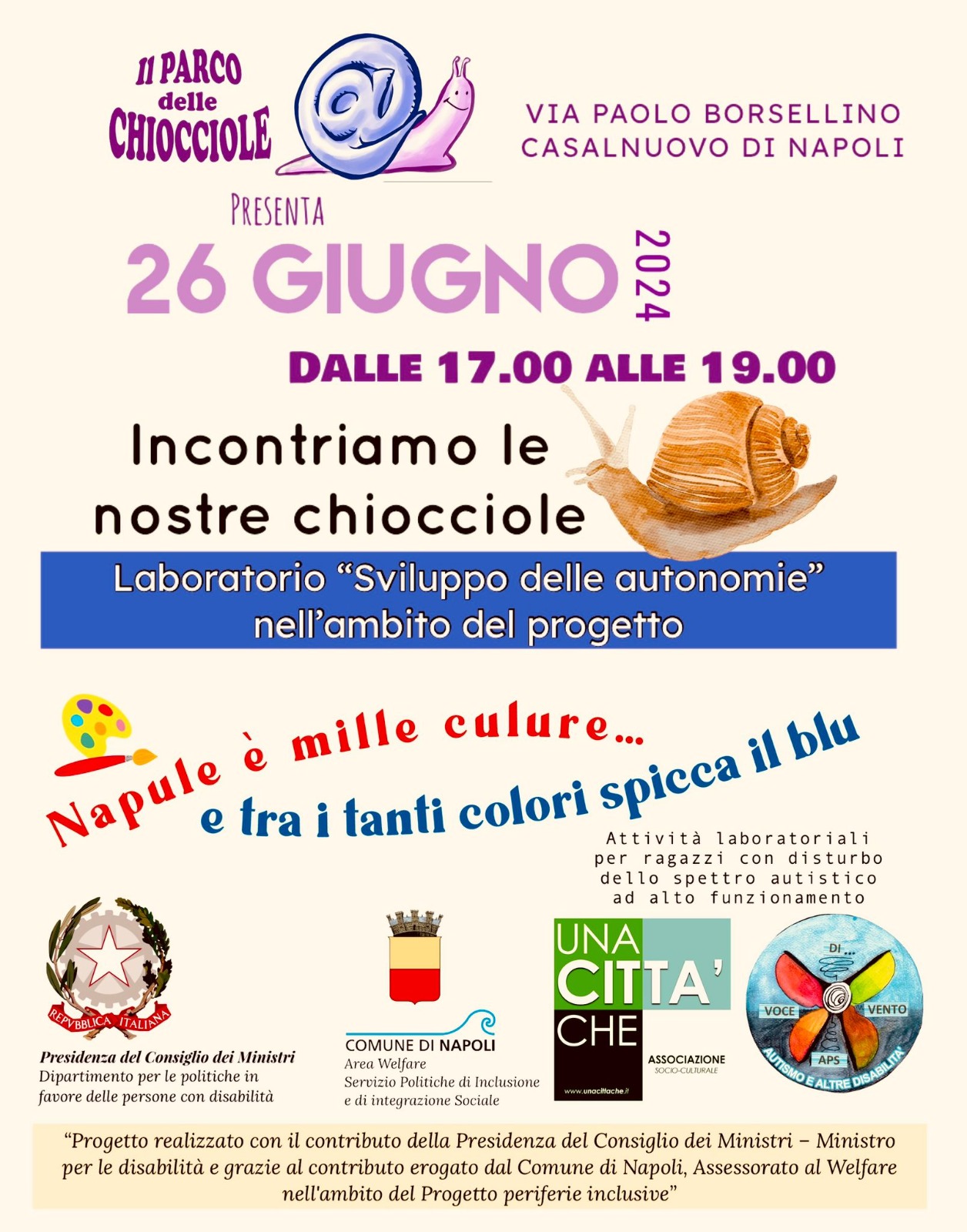 Insomma, un ottimo progetto realizzato con il contributo della Presidenza del Consiglio dei Ministri – Ministro per le disabilità e grazie al contributo erogato dal Comune di Napoli, Assessorato al Welfare nell’ambito del Progetto periferie inclusive.