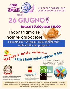 Le attività per lo “sviluppo delle autonomie” partono sin da subito con i primi quindici aderenti al progetto: il prossimo 26 giugno dalle 17.00, infatti, i ragazzi autistici dalla periferia napoletana raggiungeranno il Parco delle Chiocciole di Casalnuovo di Napoli. Nel Parco potranno incontrare le vere chiocciole, del tipo helix aspersa e chiocciole africane, allevate dalla struttura. Si immergeranno poi nell’area verde attrezzata, potendo svolgere una serie di attività socio educative, oltre che tante attività di vita quotidiana che li coinvolgeranno in una esperienza di autonomia importante.