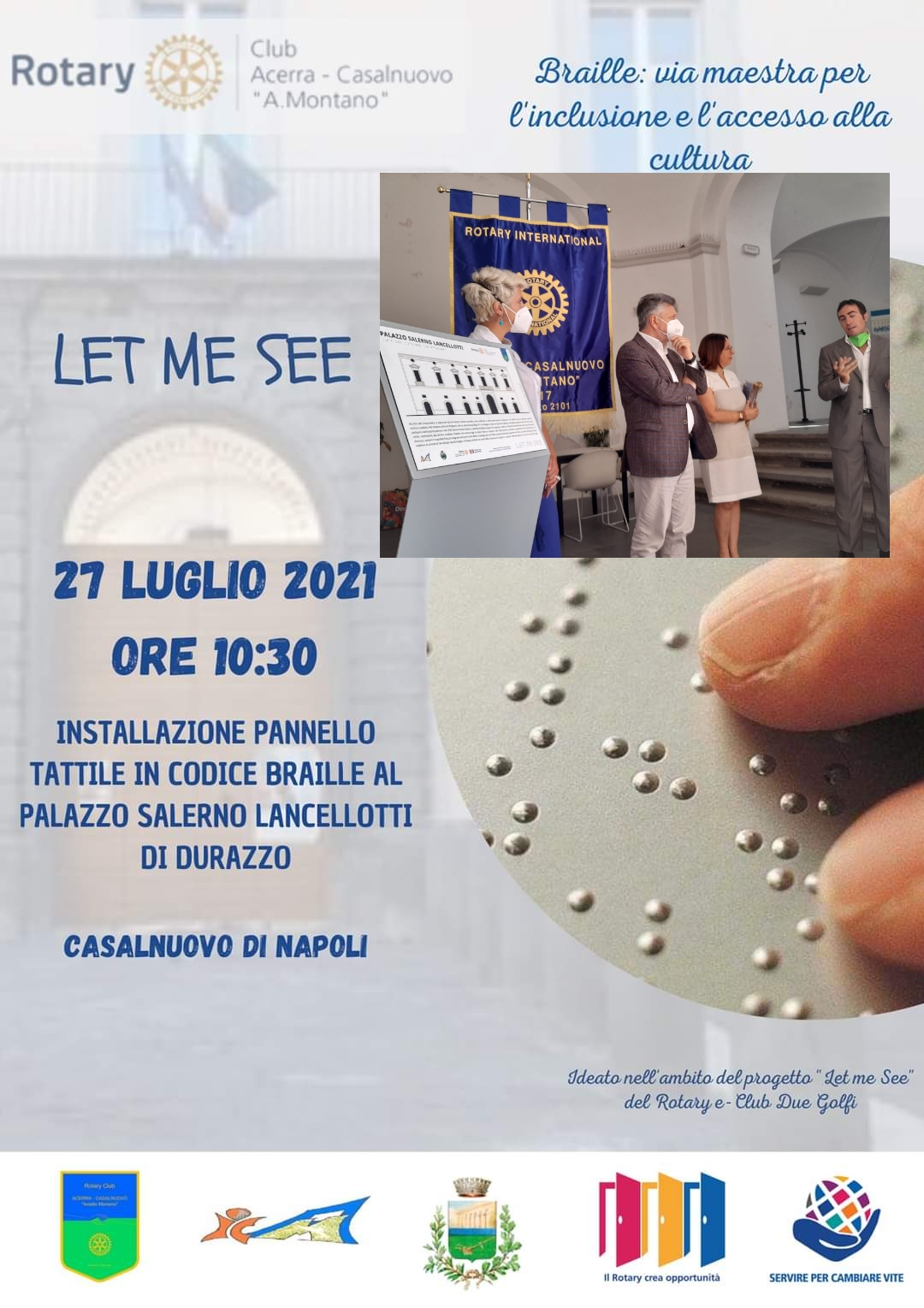 Un pannello tattile con iscrizioni in Braille è stato installato questa mattina nel piazzale del Palazzo Salerno Lancellotti a Casalnuovo di Napoli. L’installazione permanente è frutto di un service del Rotary Club Acerra-Casalnuovo “A. Montano”, anno rotariano 2020-21, pensato per permettere una condivisione del patrimonio artistico della città anche a persone con difficoltà visive, offrendo loro il piacere di poter “guardare” con le proprie dita la storia del palazzo, storica dimora settecentesca e rara testimonianza del passato della città.