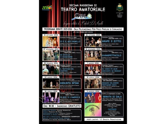 Dal 12 ottobre 2025 torna a Casalnuovo la Rassegna di Teatro Amatoriale “Oblò – Forum di Idee”, giunta quest’anno alla sua decima edizione.