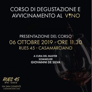 Un percorso di avvicinamento al vino con il sommelier Giovanni De Silva. È in programma dal prossimo 16 ottobre a Casamarciano nei locali del Rues 45. Cinque gli incontri in calendario, a cadenza settimanale che si terranno in orario serale, dalle 20 alle 22. Tutti i particolari del corso saranno resi noti domenica 6 ottobre alle ore 11.30 nel salotto all’aperto del Rues.