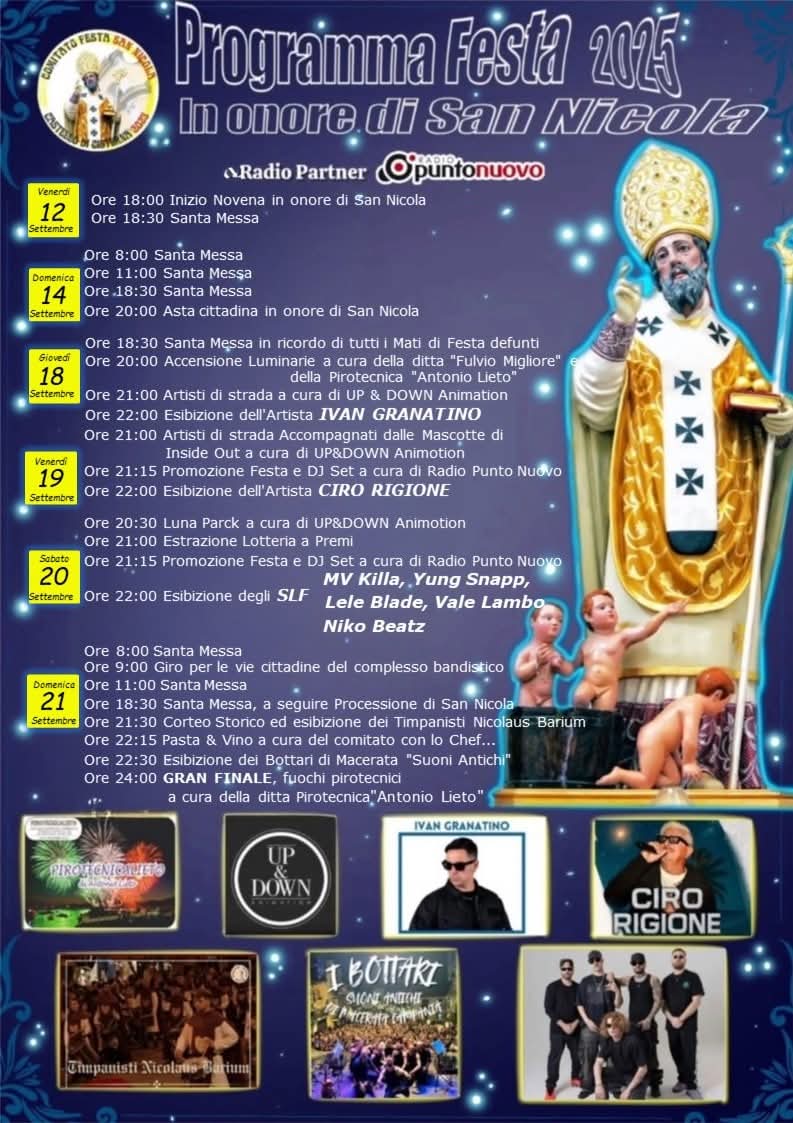 Giovedì 18 settembre il ricordo sarà rivolto ai defunti, con una Messa dedicata e l’accensione delle luminarie. A seguire, spettacoli di artisti di strada, intrattenimento a cura di Up & Down Animation ed esibizioni musicali di rilievo: tra gli ospiti attesi Ivan Granatino e, il giorno dopo, Ciro Rigione.