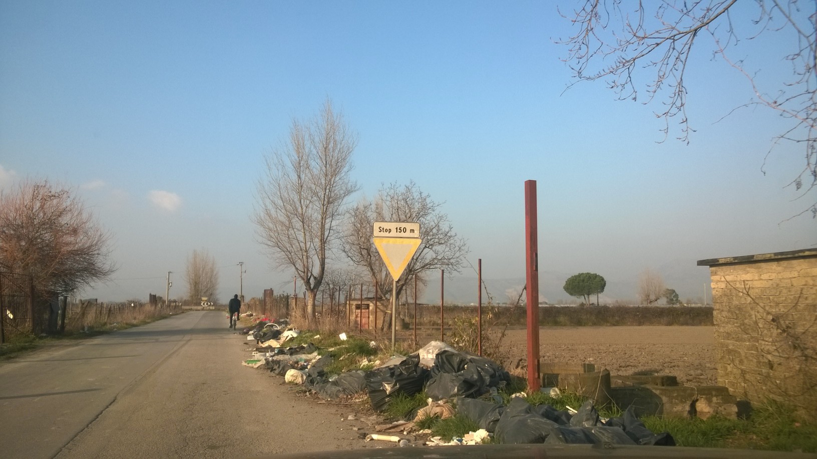 Da una delle due arterie da cui vi si può accedere – quella che collega Brusciano e Somma Vesuviana – il cartello toponomastico nemmeno si legge, bisogna addentrarsi per riuscire a decifrarlo. All’ingresso non è visibile la via d’uscita, e solo questo è sufficiente a incutere timore prima di introdurvisi, una paura che non appartiene, però, a chi la usa come sversatoio. Lastre di eternit rotte, e quindi nocive per la salute, frigoriferi, parti di altri elettrodomestici e scarti di lavori edili sono disseminati lungo il tragitto. «Io ci vado a correre in quella zona. Si può sorvolare sulla erbacce, sui bidoni messi dai contadini, però sul resto no. Nessuno si è mai preso carico di questa situazione. È imbarazzante, è una pattumiera. Si sta facendo una battaglia per una antenna wifi e poi a 500 metri c’è una discarica a cielo aperto e nessuno dice nulla», è lo sfogo di un residente di 33 anni che non vuole rendere pubblico il suo nome. La sua indignazione, però, non è stata accompagnata da azioni concrete: sostiene che la denuncia a un giornale possa dare molti più risultati. Nel ventre del viottolo ci sono sacchi di cemento vuoti, contenitori di vernice, pneumatici, e del materiale che, consumato dalle intemperie, risulta ormai irriconoscibile. Ingombrano i margini della strada anche carcasse di auto, presumibilmente oggetto di furto, smontate di quello che serviva e scaricate lì.