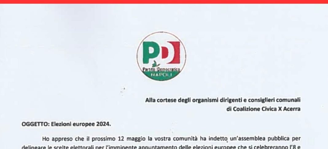 “Ho appreso che il prossimo 12 maggio la vostra comunità ha indetto un’assemblea pubblica per delineare le scelte elettorali per l’imminente appuntamento delle elezioni europee – scrive nella sua lettera il segretario metropolitano di Napoli del Partito Democratico, Giuseppe Annunziata, inviata ai dirigenti e ai consiglieri comunali di Coalizione Civica X Acerra – e “l’Europa che vogliamo” è il progetto programmatico del Partito Democratico che, anche ad Acerra ed in primis con i nostri iscritti e militanti, sottoponiamo agli elettori e su cui vorremmo costruire una collaborazione anche con Coalizione Civica X Acerra. Un programma che, penso, sia molto in linea con le vostre opzioni programmatiche”.
