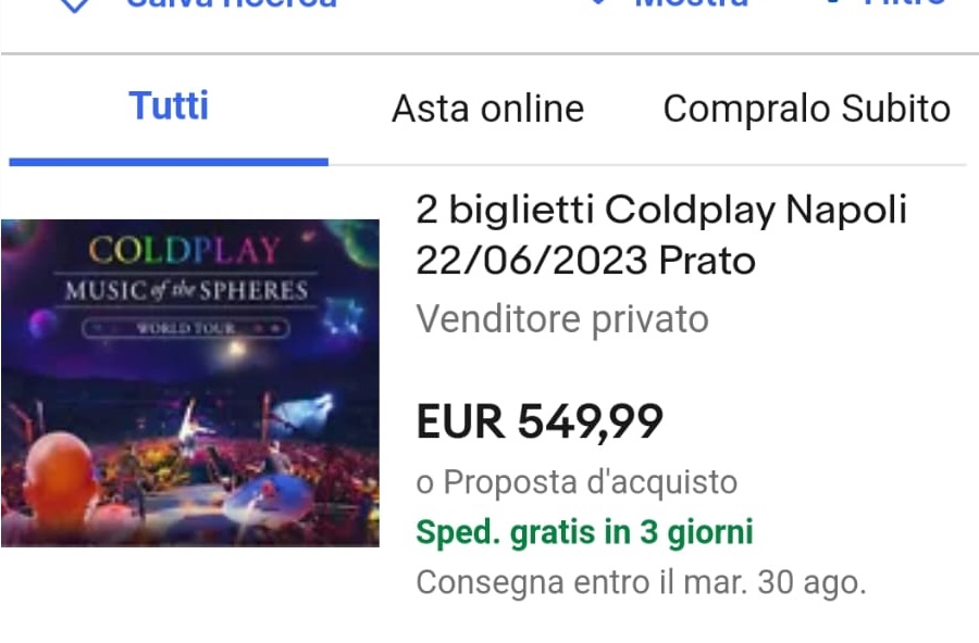 NAPOLI. “Le due tappe napoletane del concerto dei Coldplay non devono essere il trampolino di lancio per chi vuole fare affari sporchi lucrando sulla passione dei fan. Due sold out annunciati i cui contorni sulle modalità di vendita dei biglietti sono del tutto oscuri. Stanno arrivando numerose segnalazioni da parte dei fan inferociti per l’impossibilità di acquistare i biglietti mentre proliferano i siti e gli annunci sui social dove gli stessi biglietti vengono rimessi sul mercato a prezzi triplicati.”