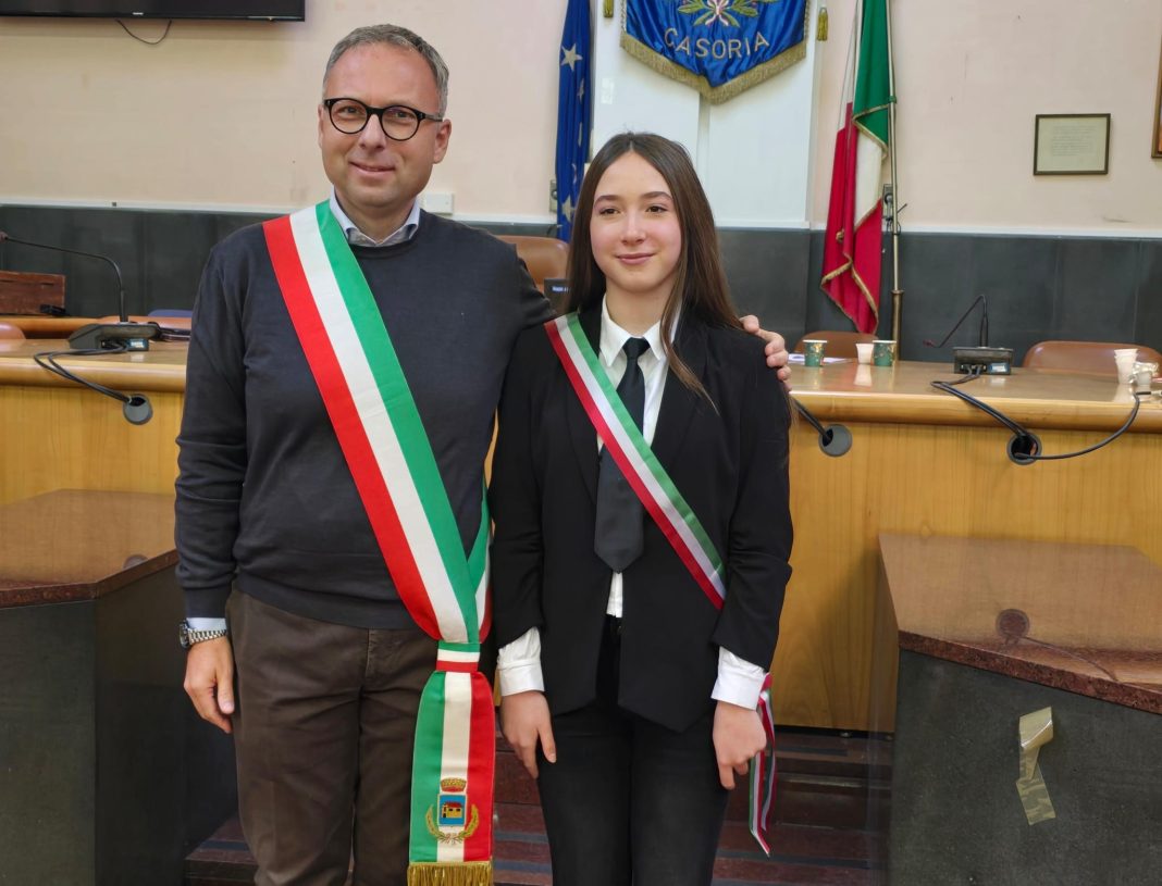 CASORIA. È Nunzia Orefice, studentessa del plesso scolastico di piazza Pisa dell’istituto comprensivo Moscati-Maglione, il sindaco junior di Casoria. La giovane studentessa, primo sindaco donna a Casoria, seppur in quest’ambito, è stata eletta questa mattina in sala consiliare, dopo un turno di ballottaggio, dai 22 membri del Consiglio Comunale dei ragazzi, eletto recentemente. Insieme agli esponenti dell’amministrazione comunale guidata dal sindaco Raffaele Bene era presente, alla seduta d’esordio, anche il Garante Regionale per i Diritti dell’Infanzia e dell’Adolescenza Giovanni Galano.