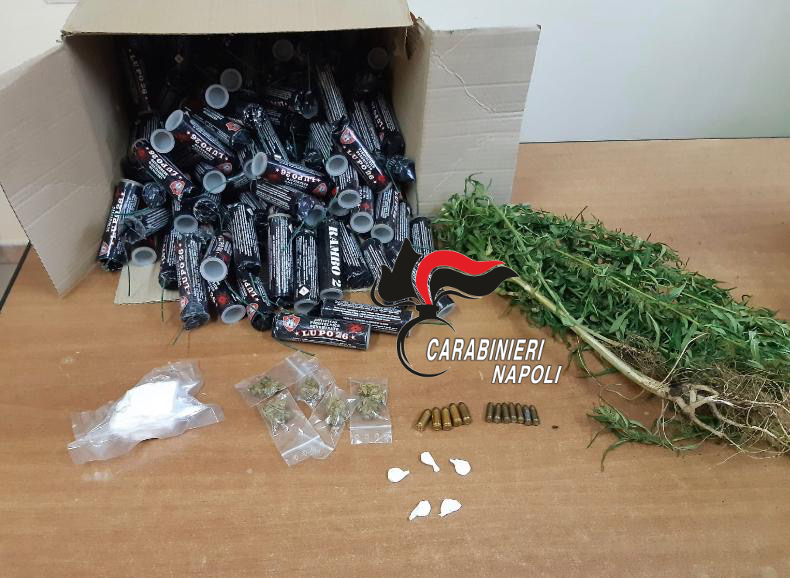 Nel Parco Macello di Casalnuovo di Napoli, in un vano ascensore della scala C e sul tetto dello stesso stabile, i carabinieri hanno trovato ancora 55 grammi di cocaina, 2 piante di cannabis indica di oltre 1 metro, 4 grammi e mezzo di marijuana, 5 cartucce calibro 9x19mm, 7 del calibro 6,35, 137 petardi “Cobra”.
