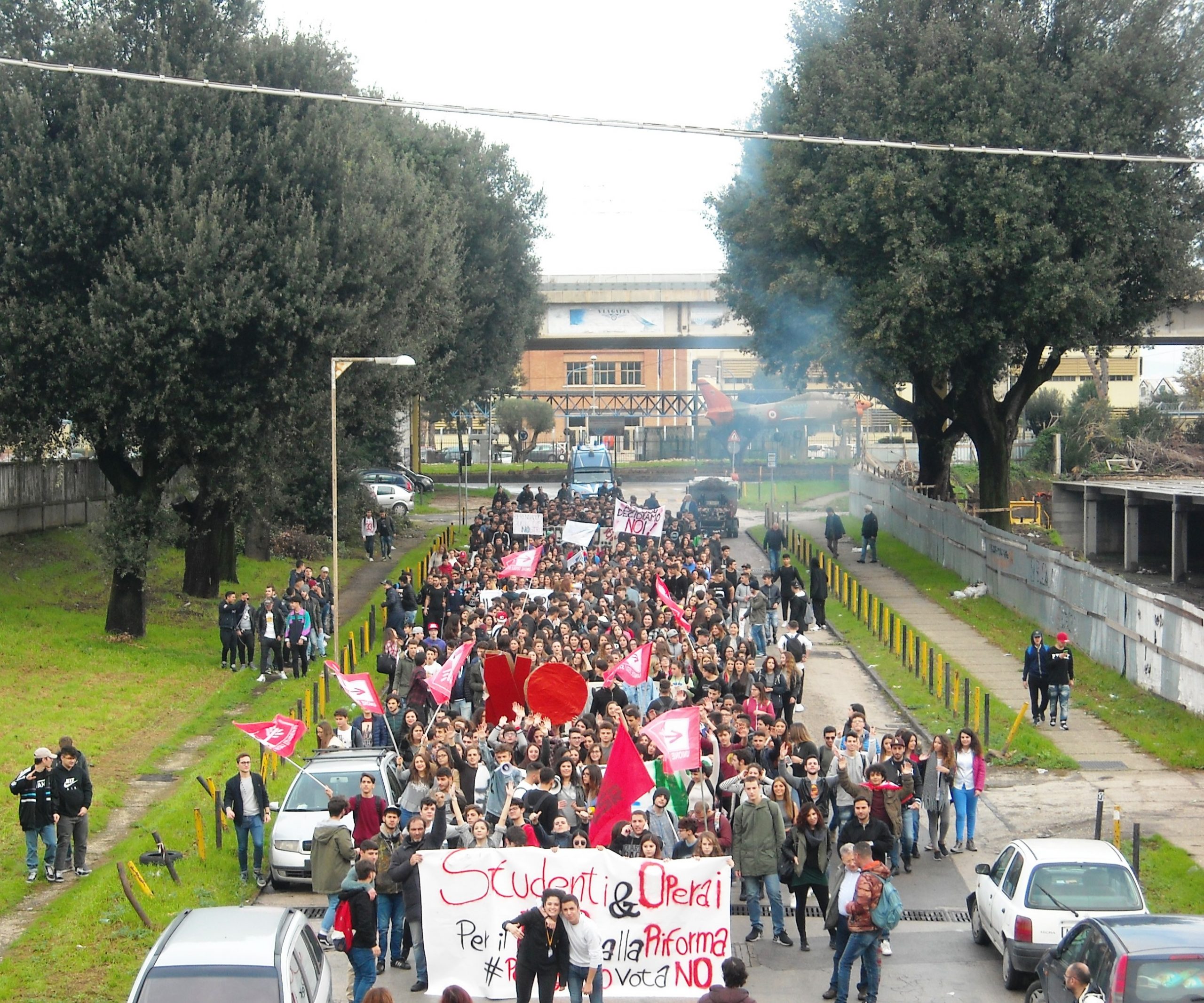 Ci si chiede cosa possa indurre un minorenne a evitare il più classico dei filoni per mettersi in fila, disciplinatamente, tra centinaia di coetanei, in mezzo alla strada, mentre minaccia pure pioggia, e a manifestare per tre ore in corteo in favore del “no” al referendum. E’ successo stamane, a Pomigliano, città delle fabbriche in crisi. Qui oltre un migliaio di studenti che frequentano gli istituti superiori della zona hanno fatto sciopero e sono scesi in piazza contro il disegno di riforma costituzionale voluto dal governo Renzi. Con loro c’erano anche i 5 operai reintegrati dalla magistratura del lavoro negli stabilimenti Fiat di Pomigliano e Nola, dopo due anni di licenziamento scaturito da una dimostrazione contro Marchionne. Il corteo di stamattina è partito dall’area delle grandi fabbriche ed ha attraversato tutta la città per poi puntare sulla Fiat. Ma una volta giunti ad alcune centinaia di metri di distanza dalla fabbrica automobilistica i manifestanti sono stati bloccati dalla polizia. A ogni modo non si sono registrati incidenti. Il tutto è stato controllato dal vicequestore Antonio Cristiano, dirigente del commissariato di Acerra.