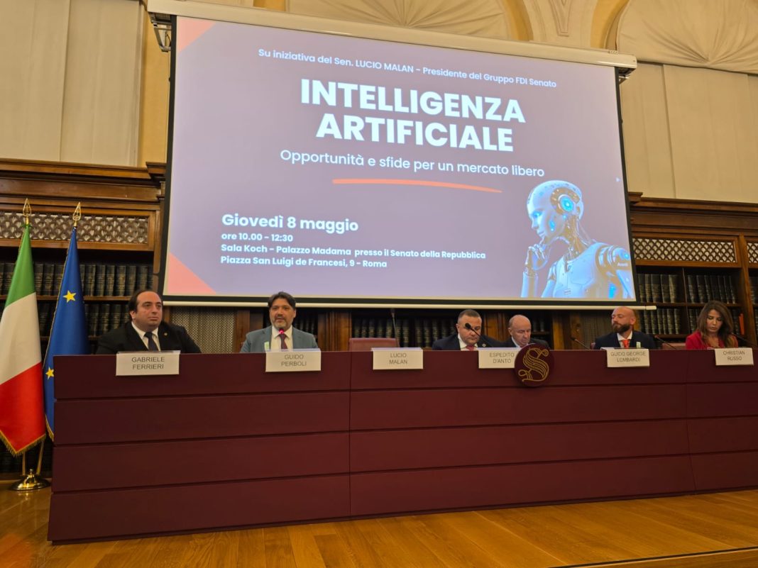 È stato presentato nella prestigiosa sala Koch al Senato della Repubblica il convegno sull’Intelligenza Artificiale su iniziativa del Sen. Lucio Malan Presidente del gruppo FDI Senato, moderato da Espedito D’Antò Presidente del Polo Abilità Digitali e con la presenza di relatori autorevoli come il politologo statunitense George Guido Lombardi che ha fin da subito sottolineato l’importanza di non sottovalutare le nuove tecnologie soprattutto nella parte della burocrazia perché leggi fluide e flessibili possono favorire il progresso.