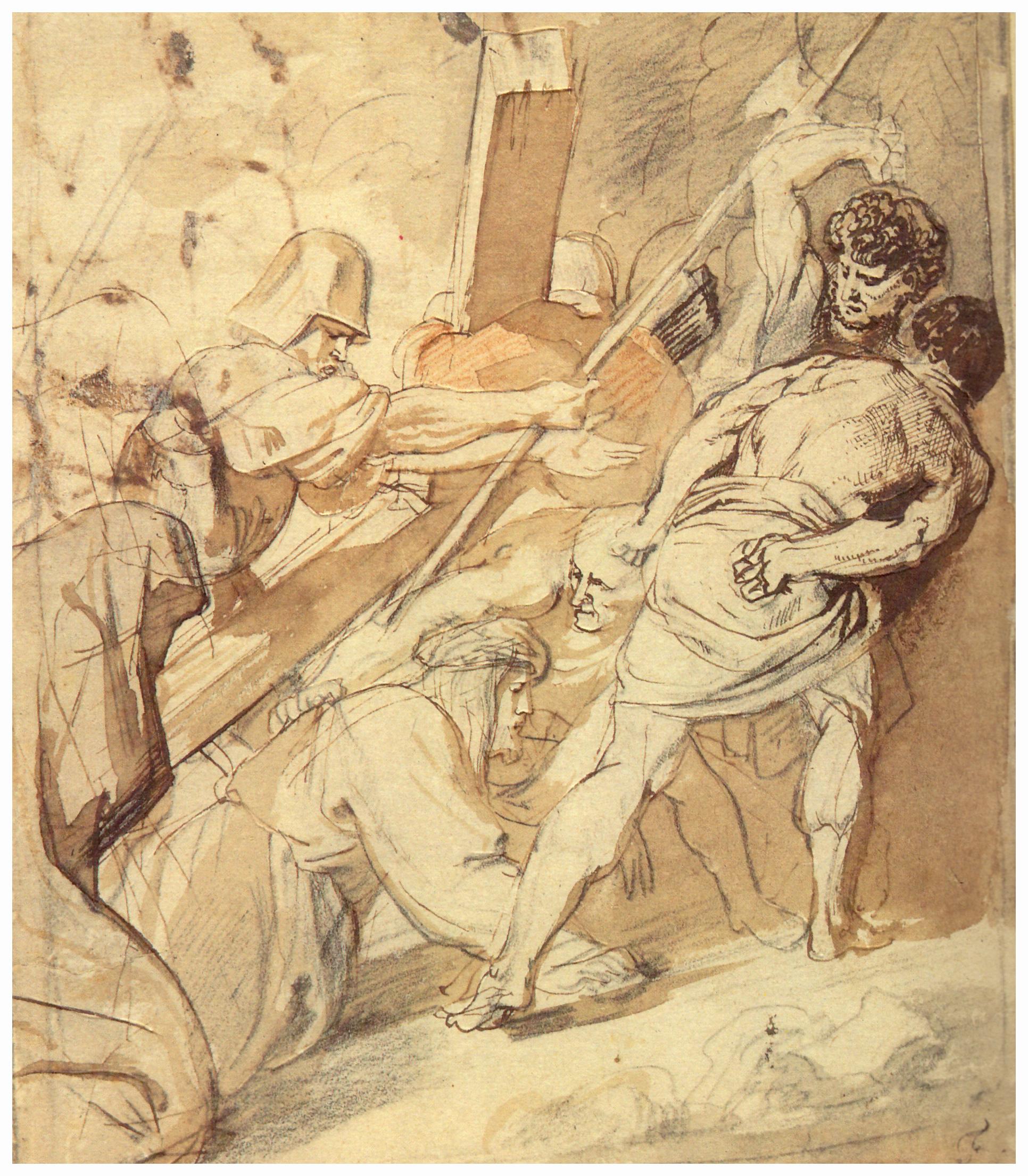 Van Dyck, allievo di Rubens, studioso e ammiratore del Rinascimento italiano, maestoso disegnatore, colorista luminoso, indagatore finissimo della fisiognomica e della psicologia, nel “foglio” della “Devonshire Collection” ricostruisce la scena con la penna, con inchiostri di varie gradazioni di seppia, e con l’acquerello. Nel disegno che è, forse, del 1635, l’artista delinea lo spazio e il piano inclinato con le travi della croce e con l’alabarda: l’ alabarda e l’elmo del soldato non rispettano il tempo storico, ma Van Dyck lo sa: l’anacronismo gli serve per portare la scena fuori del tempo, per dirci che i valori di questa scena, il sacrificio sublime, il dolore indicibile della Madre, e la banalità della miseria spirituale, sono valori che percorrono tutto il filo della storia.