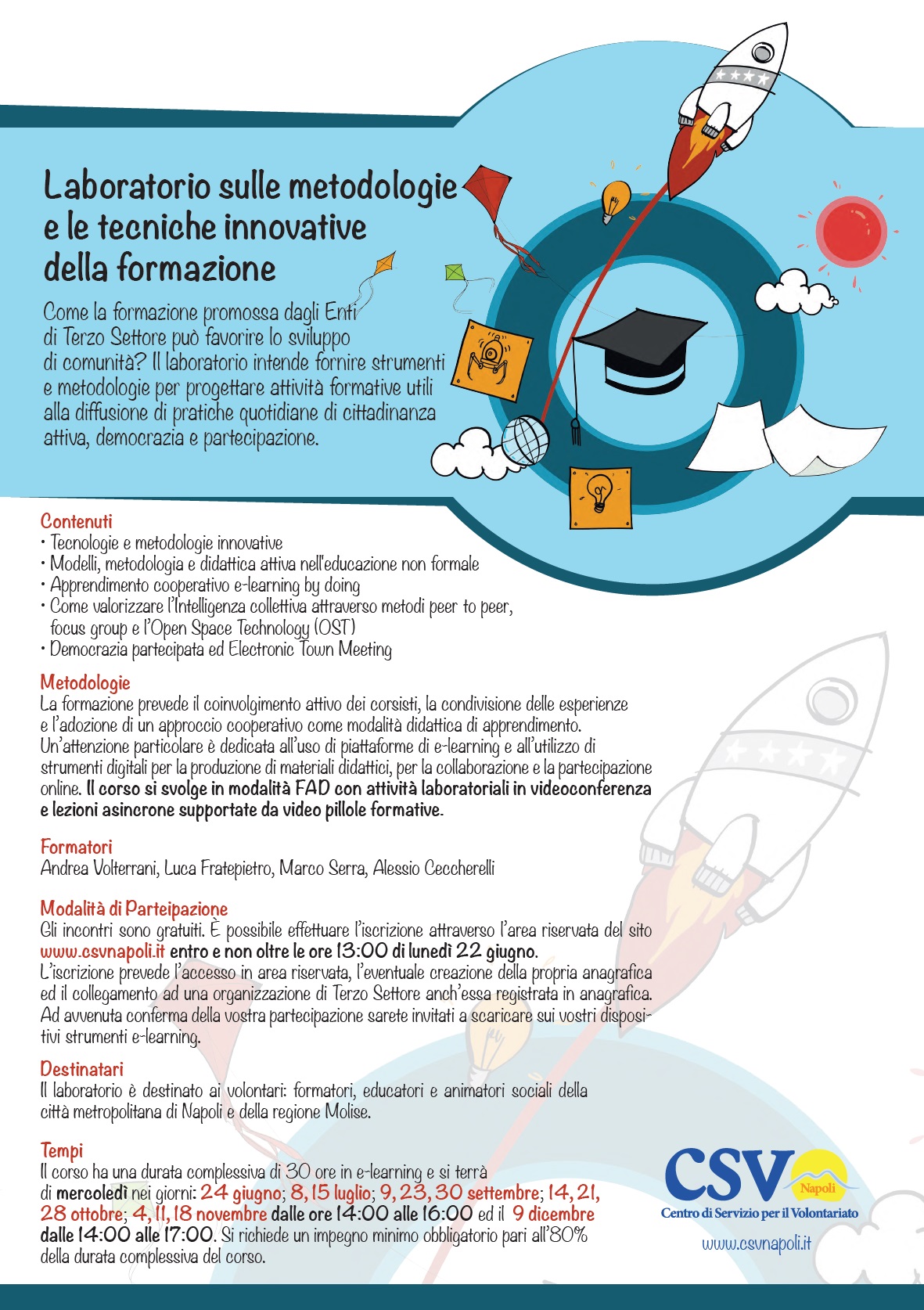 Il laboratorio, gratuito, partirà mercoledì 24 giugno ed è destinato ai volontari (formatori, educatori e animatori sociali) della Città metropolitana di Napoli e della regione Molise che saranno coinvolti attivamente per l’intera durata del Laboratorio, stimolati a condividere esperienze e ad adottare un approccio cooperativo come modalità didattica di apprendimento.