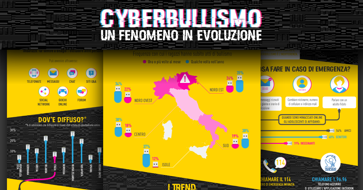 La Facoltà di Giurisprudenza dell’Università Niccolò Cusano ha effettuato uno studio e sviluppato un’infografica chiamata Cyberbullismo – Un Fenomeno in Evoluzione allo scopo di fare il punto della situazione su un fenomeno di attualità che coinvolge un numero sempre più elevato di giovani tanto da far emergere la necessità di dibattere su un’eventuale nuova normativa a tal proposito.