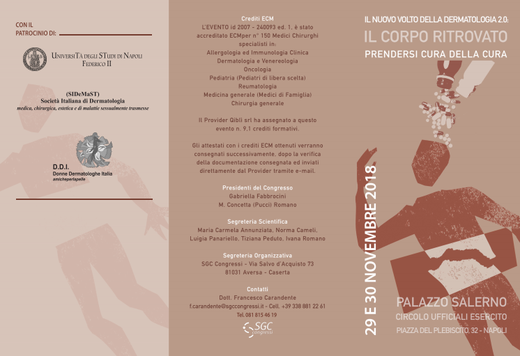 - 29 e 30 novembre – Il Corpo Ritrovato: prendersi cura della cura;realizzato in collaborazione con la Dottoressa Maria Concetta Romano, specialista in Dermatologia e Presidente del Board Scientifico “Il Corpo Ritrovato”. Il paziente che intraprende una terapia per curare una patologia oncologica (chemioterapica, chirurgica o radioterapica) subisce gravi danni a carico della Pelle. In Italia ogni anno si diagnosticano 1.000 nuovi casi di cancro. L’Ambulatorio “Il Corpo Ritrovato”, oggi punto di riferimento per tutto il Centro-Sud Italia, nasce nel 2010 per prevenire, curare e contrastare le conseguenze di terapie temporaneamente invalidanti e offre un supporto che va dall’estetica medica fino al counselling psicologico. Restituire vita e dignità al corpo logorato di un paziente oncologico è un modo fondamentale per accelerarne la guarigione fisica e psicologica.