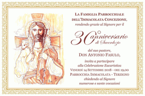 Don Franco Iannone ha già celebrato, tra il 6 e il 9 settembre, il suo anniversario, nel caloroso abbraccio dei cittadini di Quadrelle, delle autorità civili e religiose, di tutti quelli che hanno avuto la fortuna di sperimentare i suoi luminosi carismi. Don Antonio Fasulo festeggerà oggi, venerdì: mi dicono che il sindaco di Ottaviano, avv. Luca Capasso, e il consigliere comunale Vincenzo Caldarelli saranno presenti alla cerimonia per formulare gli auguri di rito e per confermare, ancora una volta, che gli Ottavianesi tutti, riconoscenti, ringraziano il parroco che volle l’incoronazione della Vergine del Carmelo.