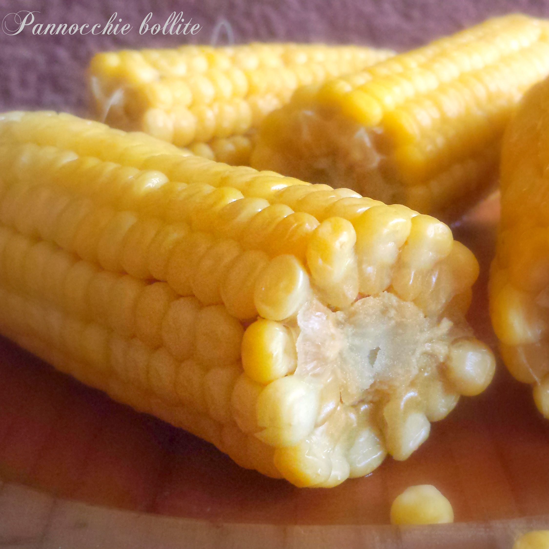Ingredienti: pannocchie di mais fresche, acqua e sale. Iniziate a pulire le pannocchie togliendo le foglie esterne e la barba e lavatele sotto un getto di acqua corrente per eliminare residui di polvere e terra. Prendete una pentola abbastanza capiente e versateci all’interno dell’acqua: riponetevi le pannocchie e un pizzico di sale grosso, quindi procedete con la cottura finché non saranno cotte a puntino.(generalmente ci mettono 15-20 minuti circa dopo che l’acqua ha iniziato a bollire).Mi raccomando le pannocchie devono essere coperte di acqua. Una volta pronte, scolatele e servitele belle calde oppure potete anche metterci un pò di burro fuso. ( dal sito:Il mondo di Adry)