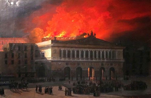 Ma sopporta tutto, anche di perdere “due falde della giacca”. Il giudizio è chiaro e netto: “non esiste nulla in Europa, non dirò che si accosti, ma che possa, magari da lontano, dare un’idea di ciò.”. E poi Stendhal aggiunge una sua riflessione, diciamo così, “politica”, che dà l’esatta misura della sua straordinaria capacità di osservazione. Scrive, il Francese, che la sala del “San Carlo”, “ricostruita in trecento giorni, è un colpo di Stato: lega il popolo al re più della costituzione data alla Sicilia, e che si vorrebbe avere a Napoli” (la costituzione data alla Sicilia è quella del 1812). Il teatro “San Carlo” venne devastato dalle fiamme nella notte tra il 12 e il 13 febbraio del 1816: fu ricostruito in meno di 300 giorni, e organizzò e guidò gli operai l’architetto Antonio Niccolini, scelto da Giuseppe III, principe di Ottajano, che Ferdinando I aveva nominato “Sovrintendente” per i lavori. Giuseppe III era fratello di Luigi de’Medici (In appendice l’immagine del quadro che Pitloo dedicò all’incendio). Quando parte da Napoli, Stendhal scrive: “Non dimenticherò certamente né la via Toledo, né la vista che si ha di tutti i rioni. Napoli è, senza paragone, ai miei occhi, la più bella città dell’universo…malgrado le sue trecentomila anime, è come una casa di campagna posta in mezzo a un bel paesaggio….Questo golfo così bello, che sembra fatto apposta per il piacere degli occhi, le colline a ridosso di Napoli, tutte guarnite di alberi, la passeggiata a Posillipo…tutto ciò non si può meglio esprimere che dimenticare.”