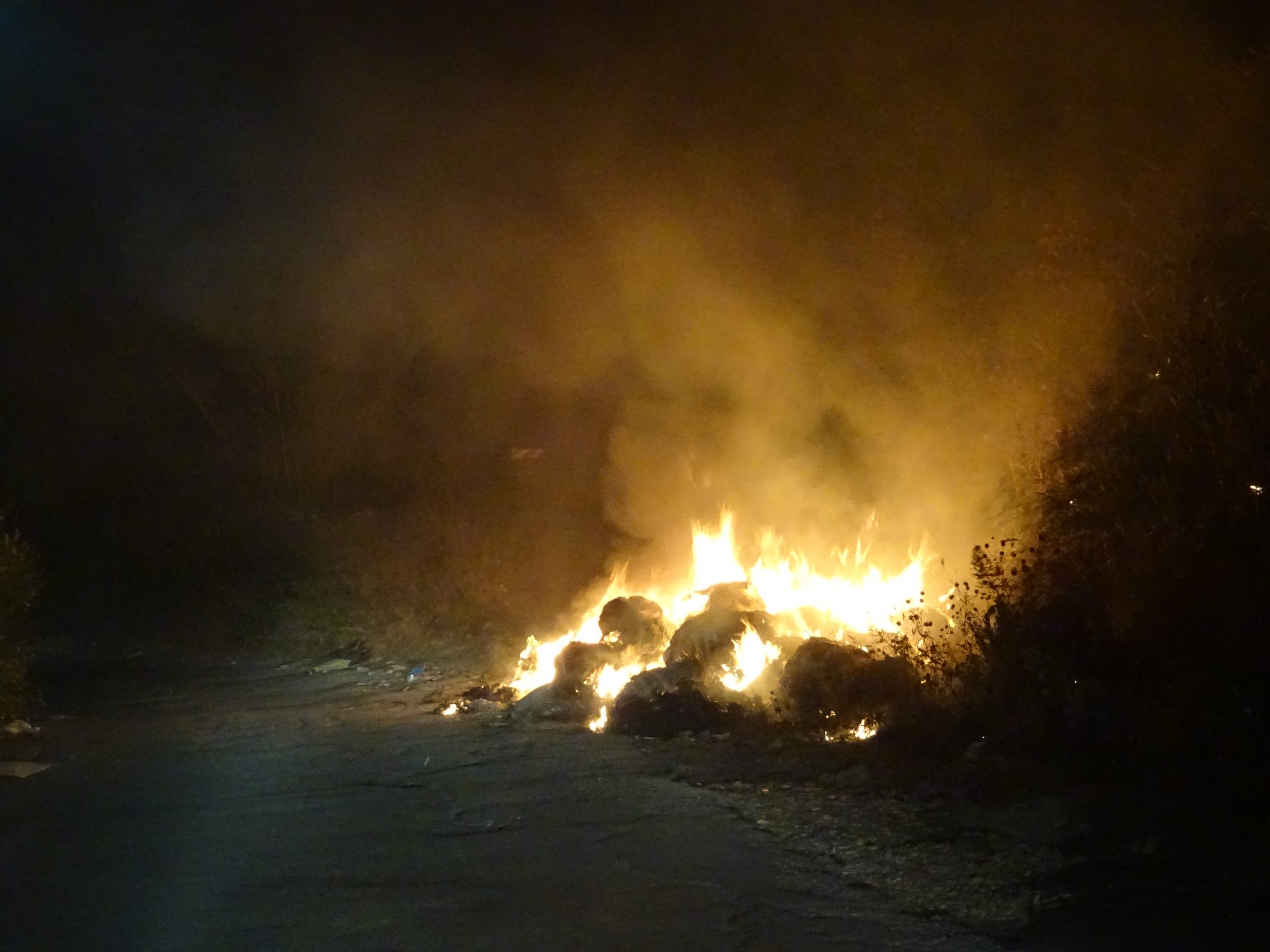 Qui basta poco per renderci conto che ancora una volta il nostro intuito aveva fatto centro, ci troviamo subito davanti ad un rogo, rimaniamo chiusi dentro l’auto per precauzione, e cerchiamo di contattare i Vigili del Fuoco, ma invano per l’intasamento delle linee; chissà quante situazioni del genere avranno affrontato in questa secca e ventosa serata di fine primavera. Alla fine ci rispondono i Carabinieri che dirotteranno ai pompieri l’informazione.