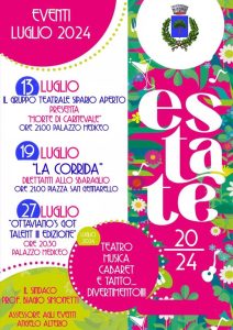 Teatro, musica, divertimento e l’attesissimo talent show che ormai da anni valorizza gli artisti emergenti di Ottaviano. È un luglio ricco di appuntamenti quello programmato dall’amministrazione comunale guidata dal sindaco Biagio Simonetti e nello specifico dall’assessore agli eventi Angelo Alterio. Si comincia sabato 13 luglio con la rappresentazione teatrale “Morte di Carnevale”, messa in scena dalla compagnia “Sipario Aperto”. Appuntamento alle 21 a Palazzo Mediceo.