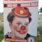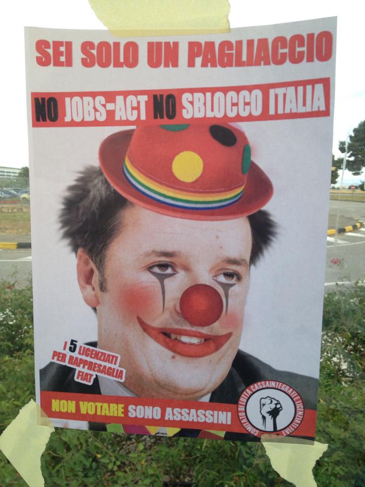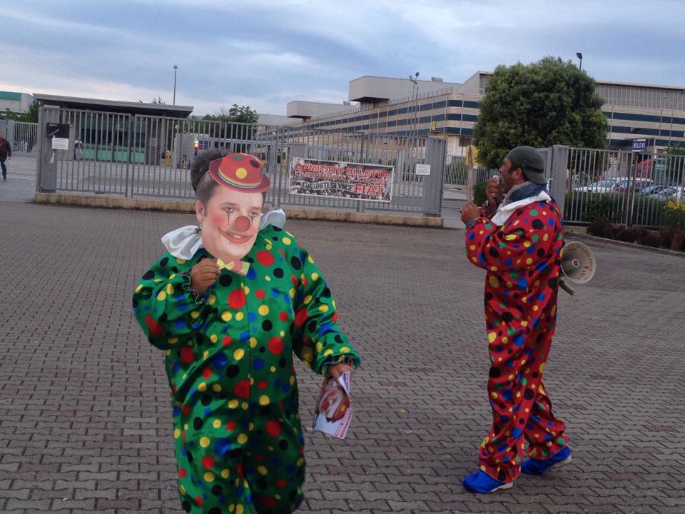 Quando si mettono a confronto la foto di Renzi insieme e John Elkann, a Sergio Marchionne e agli operai nuovi assunti di Melfi con quella che ritrae i cinque licenziati della Fiat di Pomigliano, vestiti da pagliacci e travisati dalla maschera del presidente del Consiglio, salta all’occhio immediatamente una sensazione netta: che ritraggono due mondi diversi, completamente opposti. Nel primo c’è l’eleganza del vestire, il dinamismo, il benessere, l’efficienza, l’andare a carro armato sulla strada dei progetti industriali e finanziari. Nel secondo pianeta si distinguono invece la voglia di dissentire, la creatività di chi ce la sta mettendo tutta per riottenere il posto di lavoro, la provocazione satirica che però non può nascondere le facce stanche della fatica di vivere. Intanto l’asse Renzi-Marchionne oggi ha “battezzato” le oltre mille nuove leve operaie della grande fabbrica lucana, che in questo momento è l’unica della FCA in Italia davvero a pieno regime, con i suoi tre modelli di vettura, 500 x, Renegade e Grande Punto. “E assumeremo a breve altri mille lavoratori”, ha annunciato proprio stamattina l’ad di FCA. Contemporaneamente manifestavano davanti al super stabilimento, vestiti da pagliacci e con la maschera del Matteo nazionale, riveduta e corretta in chiave claunesca, Mimmo Mignano, Marco Cusano, Massimo Napolitano, Antonio Montella e Roberto Fabbricatore. I cinque operai sono stati licenziati l’anno scorso per aver protestato esibendo un fantoccio di Marchionne impiccato a un patibolo. L’ennesima provocazione per denunciare i due suicidi di altrettanti cassintegrati di Pomigliano, Pino De Crescenzo e Maria Baratto, trasferiti come la maggior parte di loro in quello che chiamano “il reparto confino di Nola”. I cinque estromessi hanno anche realizzato un manifesto che ritrae il volto di Renzi in versione clown. “Abbiamo fatto questo perchè lui fa solo pagliacciate – dice Mignano – butta soltanto fumo negli occhi profittando di quei pochissimi posti dove ancora si lavora, magari da schiavi. Intanto il Paese è in ginocchio e aziende come la Fiat fanno quello che vogliono, calpestando le più elementari leggi della democrazia”.